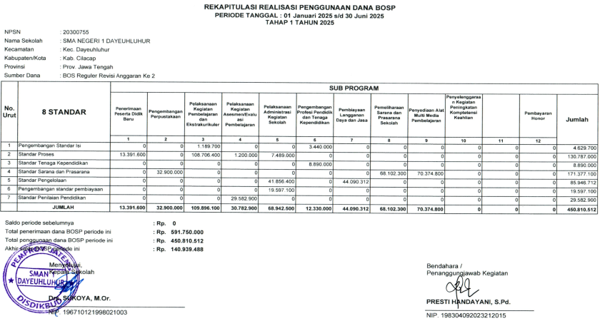 Berikut adalah Rekapitulasi realisasi penggunaan dana BOSP Semester 1 Tahun Anggaran 2025, dimana dari total anggaran BOSP Semester 1 yang diterima Satuan Pendidikan yaitu Rp. 591.750.000,- yang dapat direlisasi oleh satuan pendidikan sampai dengan bulan juni sebesar Rp. 450.810.512 jadi terdapat sisa anggaran Semester 1 sebesar Rp. 140.939.488,-. Adapun penggunaan anggaran sampai bulan juni yaitu diperuntukan belanja Barang dan Jasa sebesar Rp. 292.732.112, Belanja Modal Rp. 158.078.400,- ( terdiri dari Belanja Modal Peralatan sebesar Rp. 125.178.400,- dan Belanja Modal Buku Sebesar Rp. 32.900.000,- )
